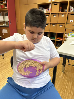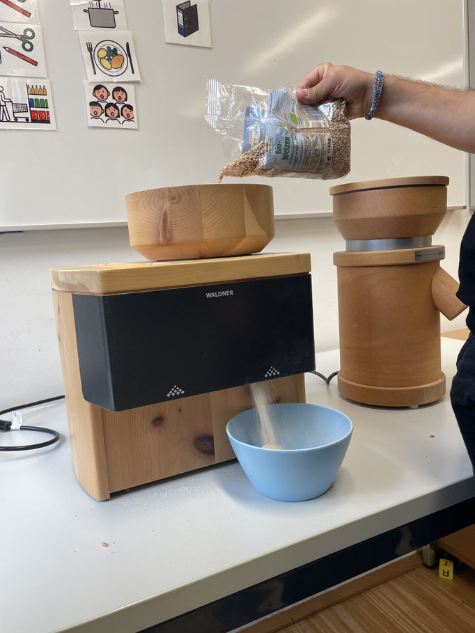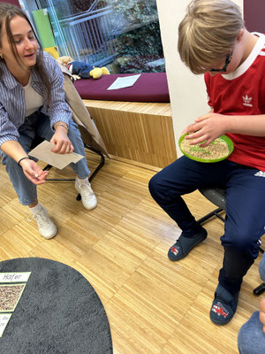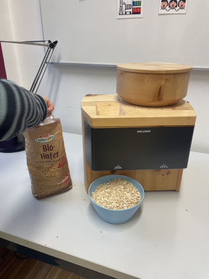 In der ersten Woche lernte die Kinder verschiedene Getreidearten kennen. Ein besonderes Highlight war das Herstellen von Haferflocken mit einer Flockenquetsche. Aus den frischen Flocken wurde dann im Kochunterricht ein Apfel-Zimt-Haferbrei zubereitet. Dieser war nicht nur gesund, sondern auch bei allen sehr beliebt.