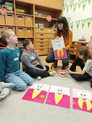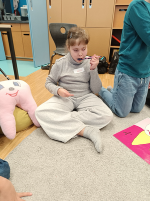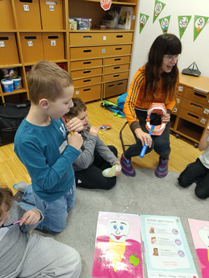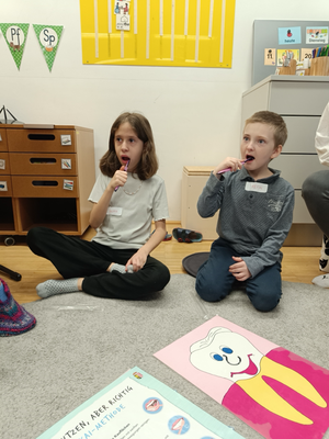Anschließend durfte jedes Kind mit seiner neuen Zahnbürste, die es als Geschenk bekam, gleich ausprobieren, wie man richtig Zähne putzt. Mit viel Spaß und guter Laune wurden wir zu echten Zahnputzprofis!